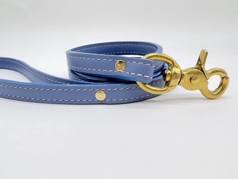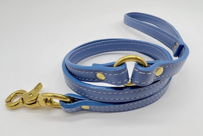 The leash is made out of blue greyish leather and includes a small red pinkish purse (matching to the King Collar) that can be used to put poop bags or some treats. The mini purse can be detached and is also helpful to put your keys or money in if you go around the corner to buy something. The width of the leash is 13mm.