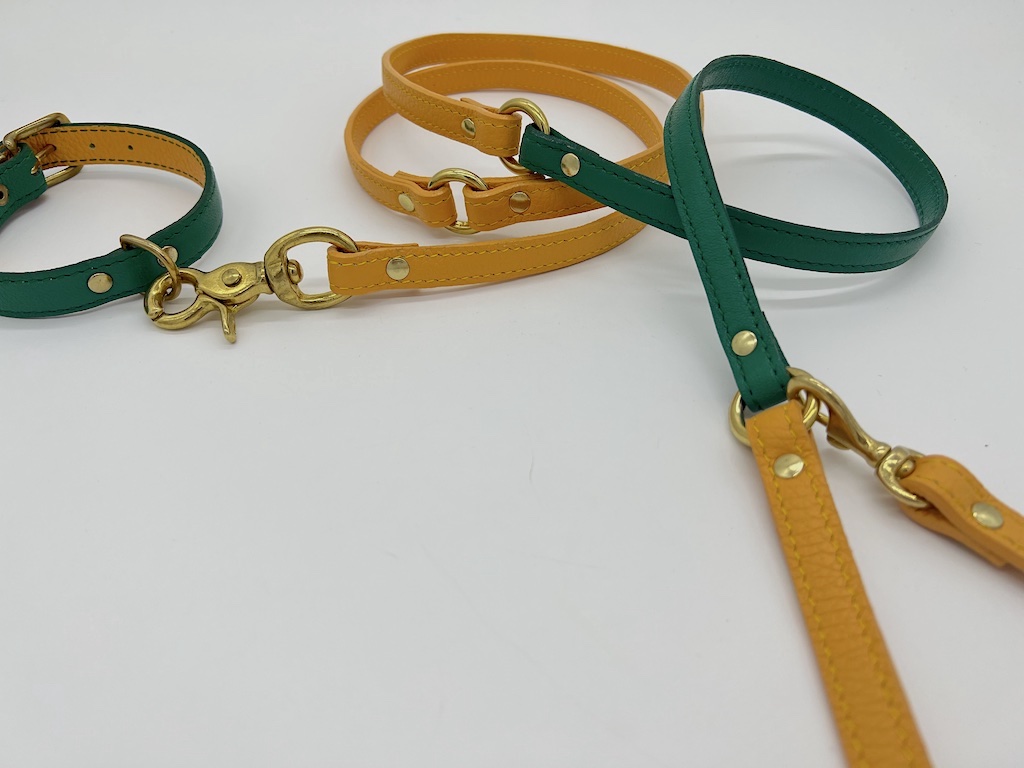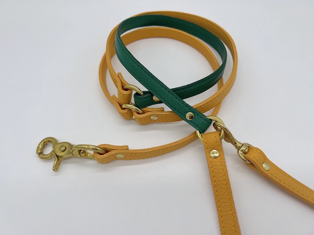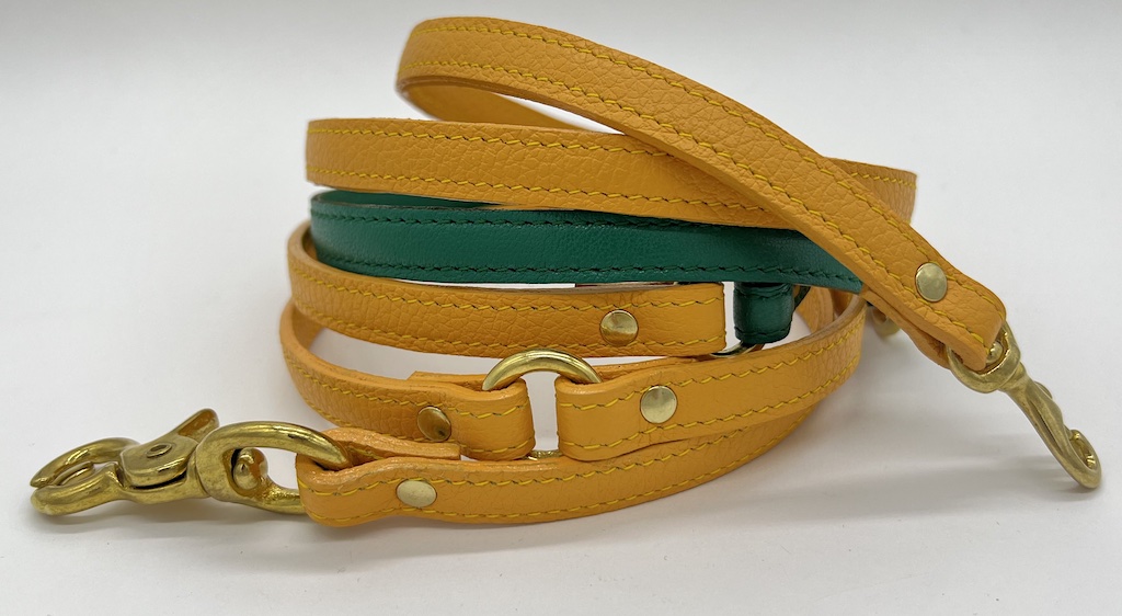 The Rio Leash is made out of dark yellow leather and one part out of dark green leather (the Short Rio Leash has the handle in dark green). It includes a small dark green mini purse that can be used to put poop bags or some treats. The mini purse can be detached and is also helpful to put your keys or money in if you go around the corner to buy something. The width of the leash is 13mm.